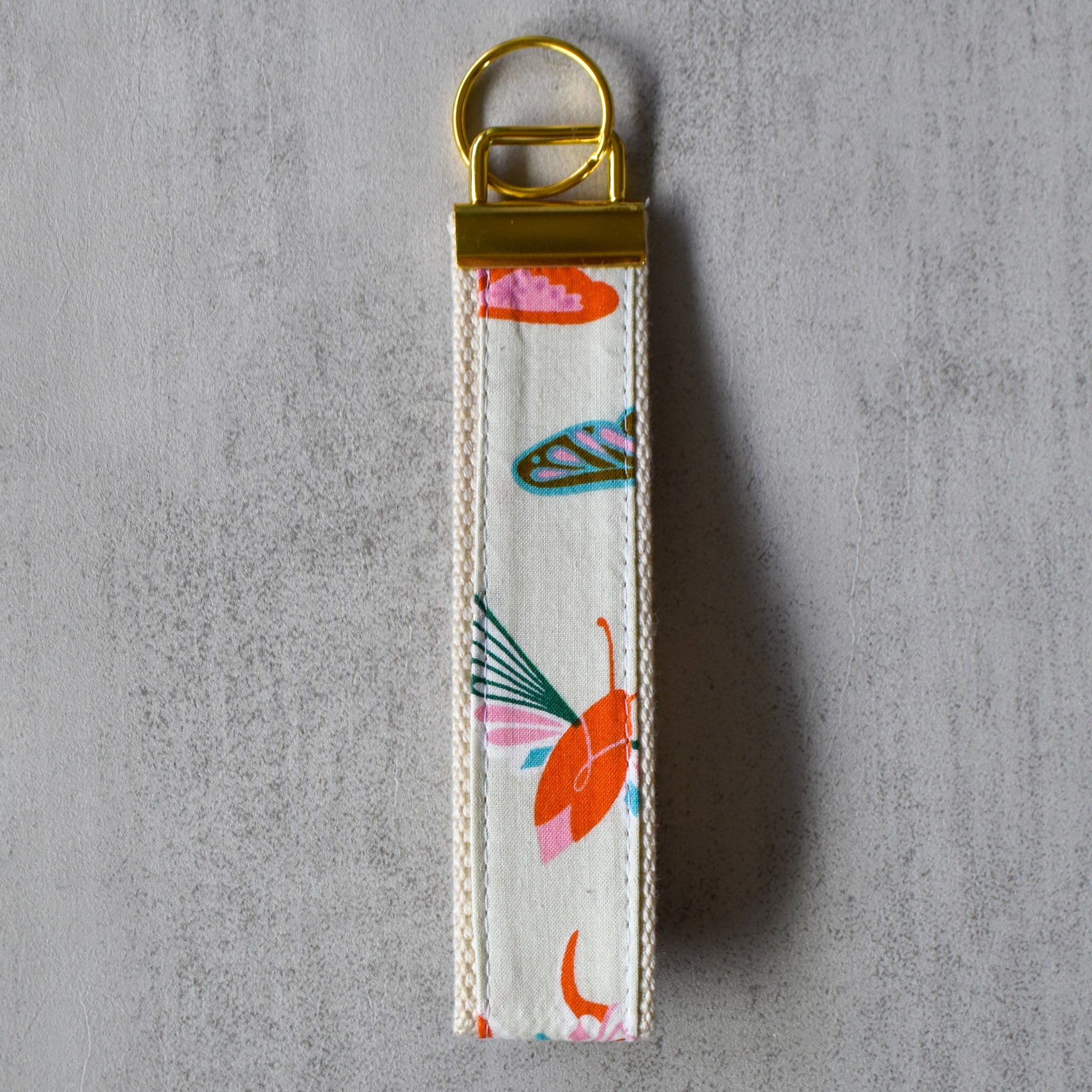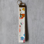 Light and breezy, the All A Flutter key fob features delicate butterflies fluttering across a soft pale mint background. Handmade from leftover fabric scraps, it’s a charming and practical way to keep your keys close—whether slipped on your wrist or clipped to your bag.