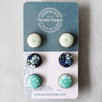 Crafted from repurposed fabric and finished in a clean bezel setting, these studs are lightweight, comfortable, and simple to style. Whether featuring smooth glass or exposed fabric texture, each set brings subtle color and personality to everyday wear.