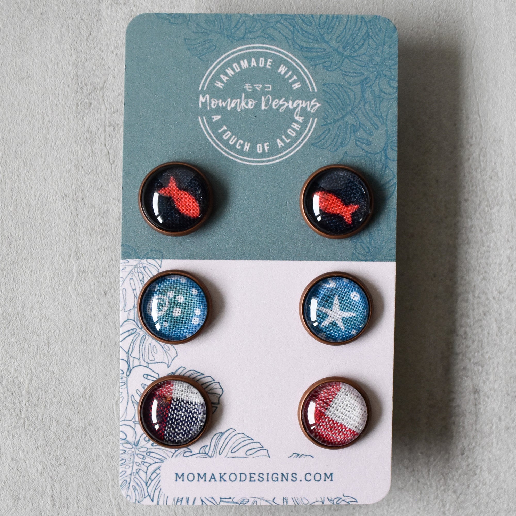 Made in small batches on Kauaʻi, Hawaiʻi. Because of the handmade process and fabric variations, no two stud sets are exactly the same.