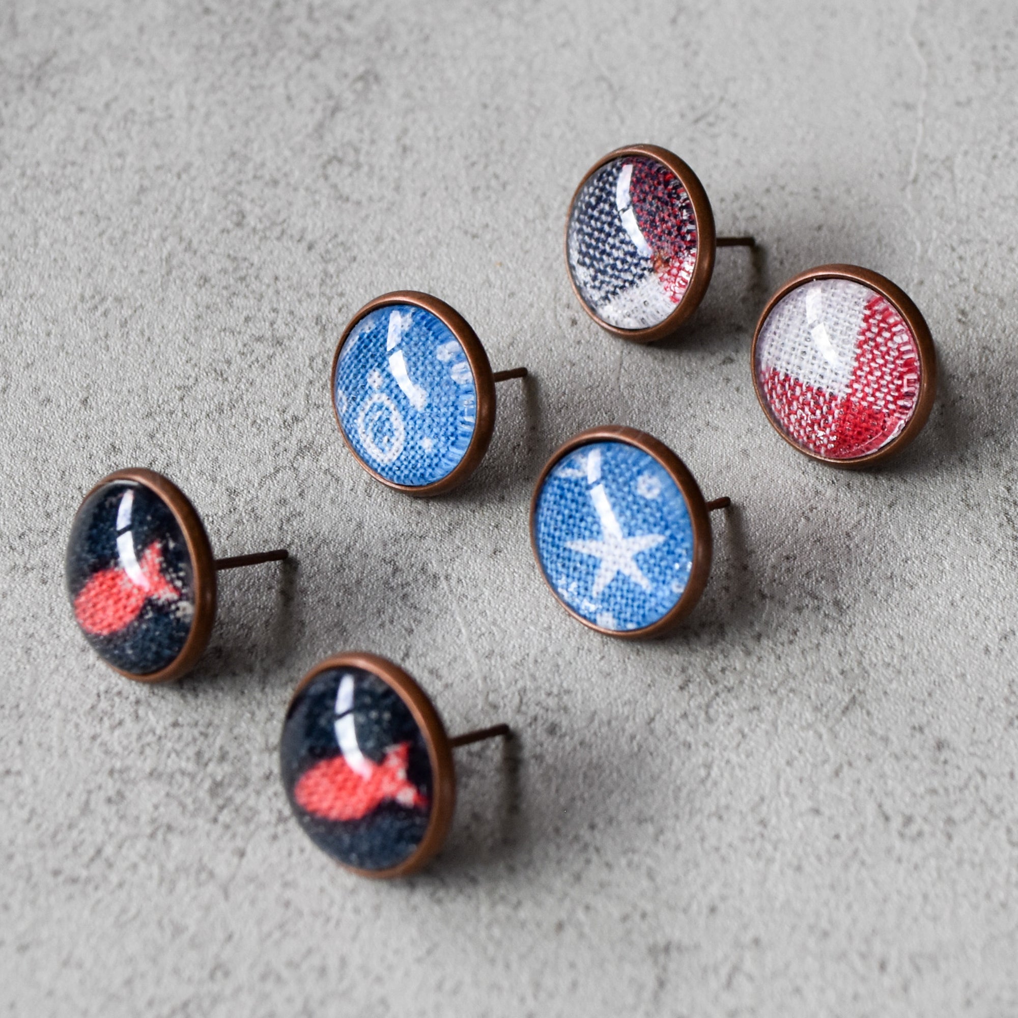 Crafted from repurposed fabric and finished in a clean bezel setting, these studs are lightweight, comfortable, and simple to style. Whether featuring smooth glass or exposed fabric texture, each set brings subtle color and personality to everyday wear.