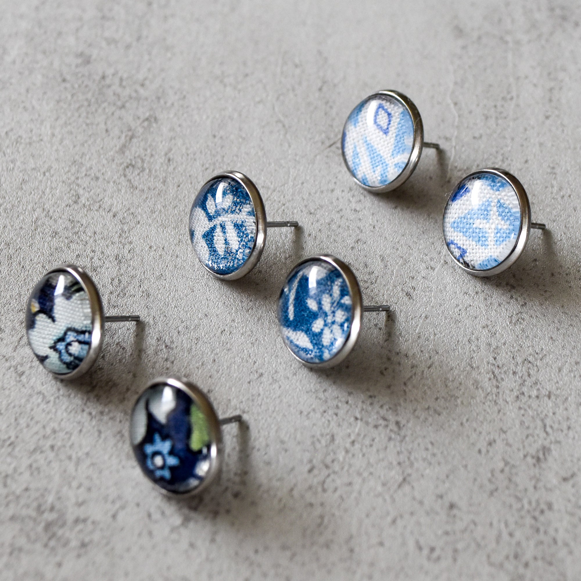 Crafted from repurposed fabric and finished in a clean bezel setting, these studs are lightweight, comfortable, and simple to style. Whether featuring smooth glass or exposed fabric texture, each set brings subtle color and personality to everyday wear.
