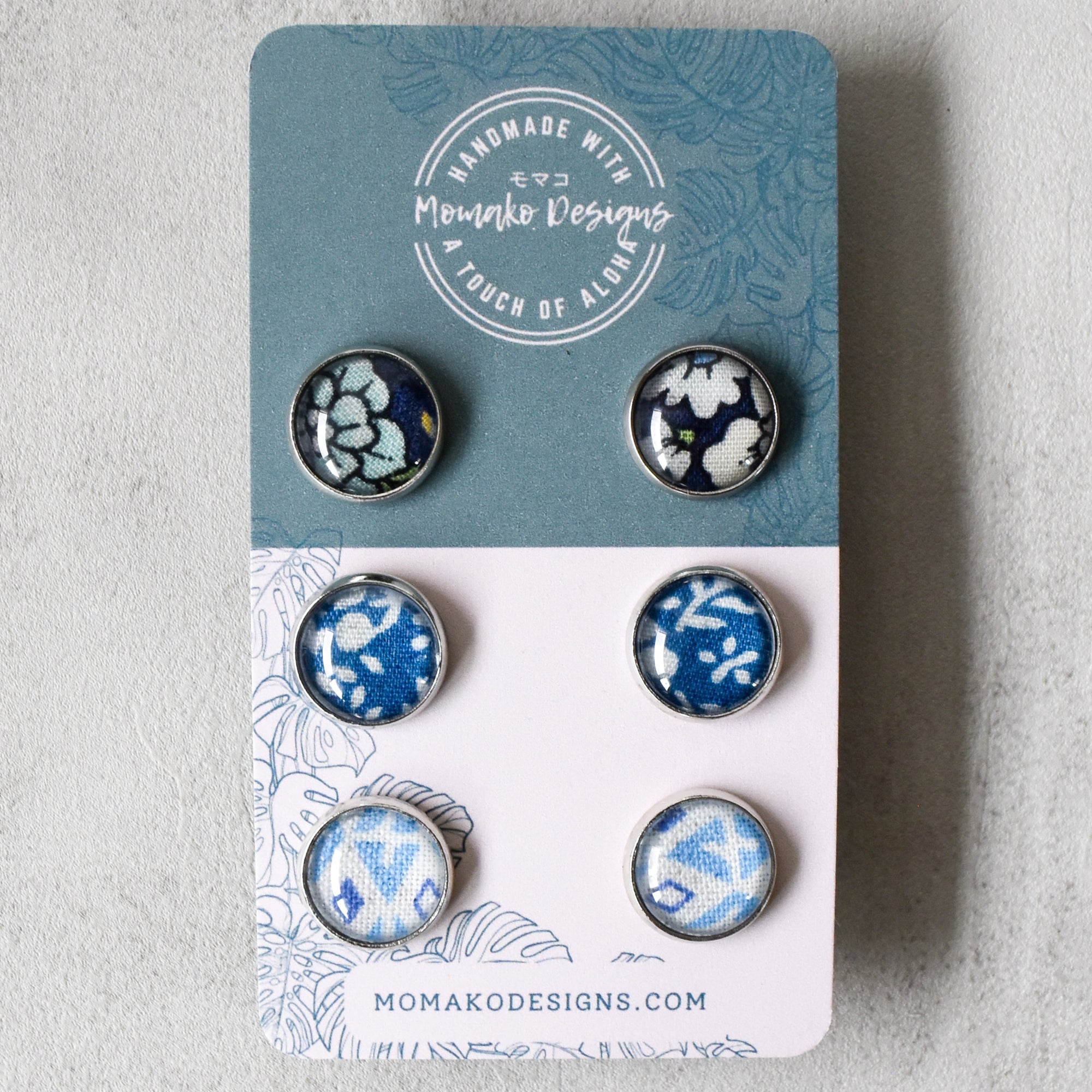 Made in small batches on Kauaʻi, Hawaiʻi. Because of the handmade process and fabric variations, no two stud sets are exactly the same.