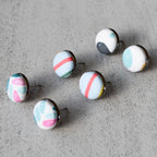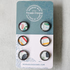 This soft trio blends white, pale blues, and hints of color in abstract and stripe patterns, each perfectly framed by a sleek gunmetal bezel. The polished metal rim adds a modern edge that complements the gentle, airy palette, making these earrings ideal for everyday wear with a subtle artistic flair.