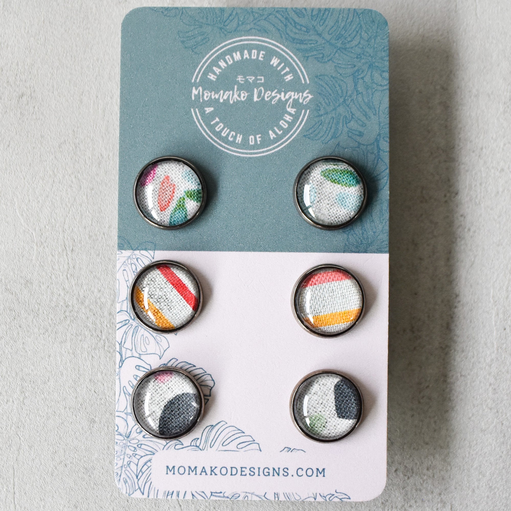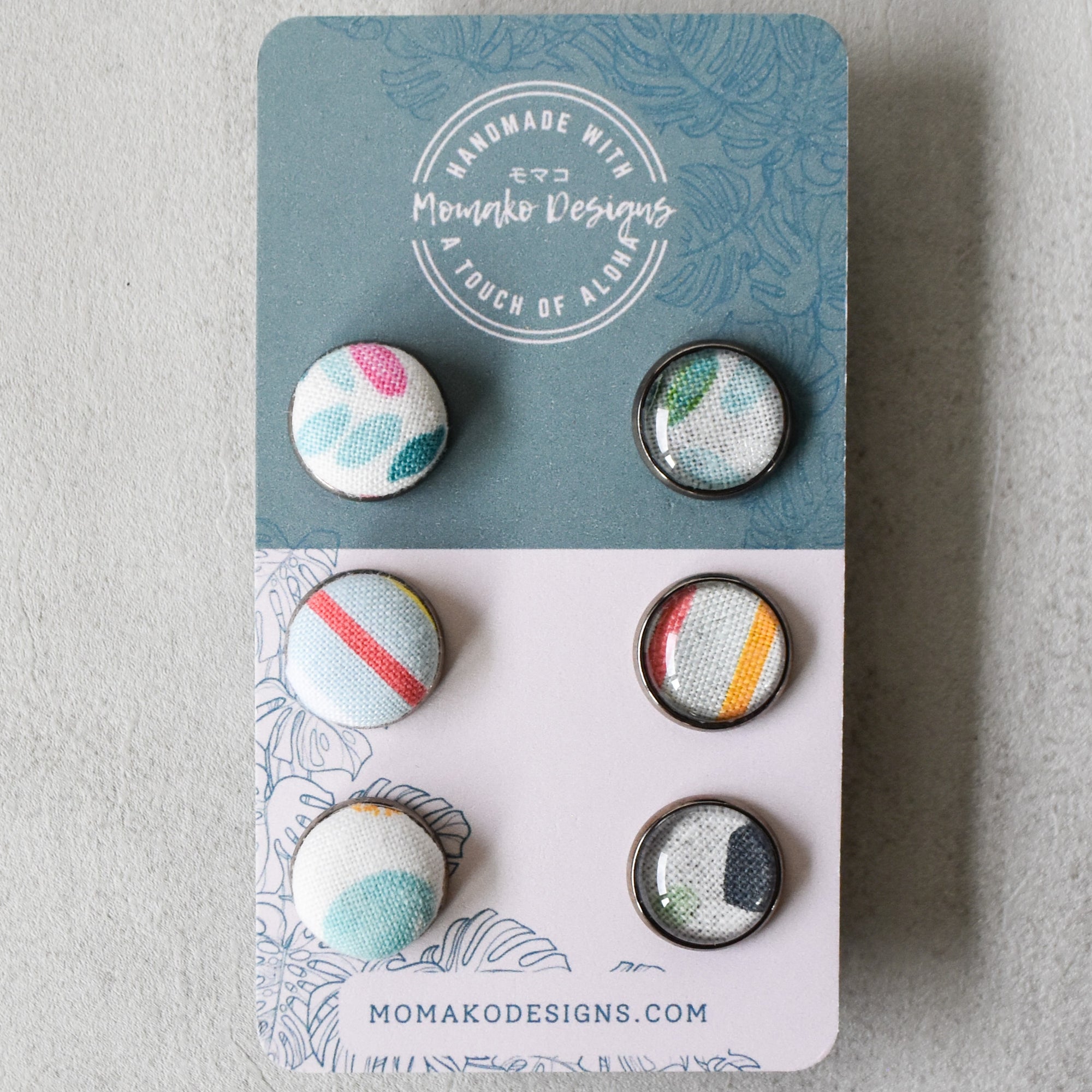 Made in small batches on Kauaʻi, Hawaiʻi. Because of the handmade process and fabric variations, no two stud sets are exactly the same.