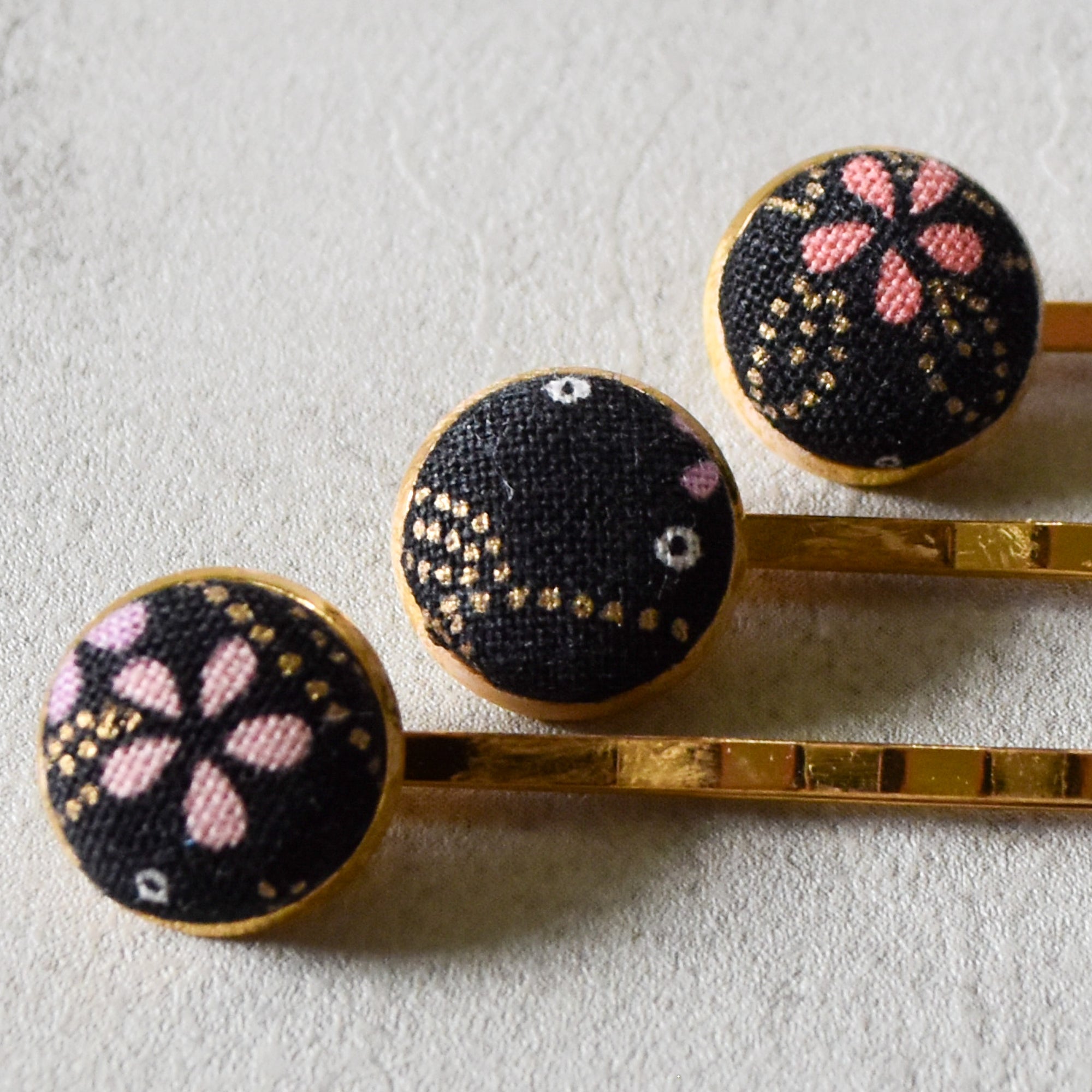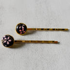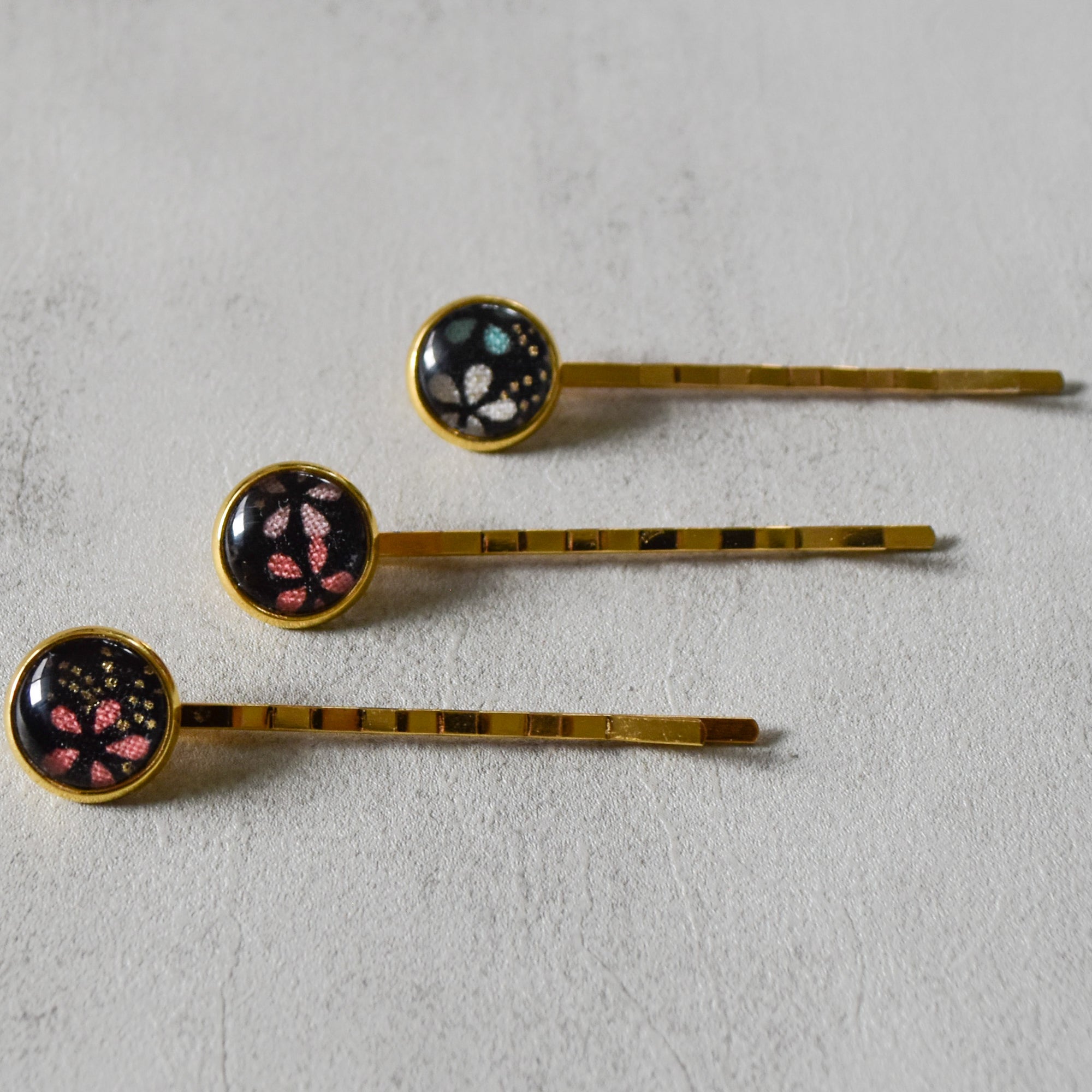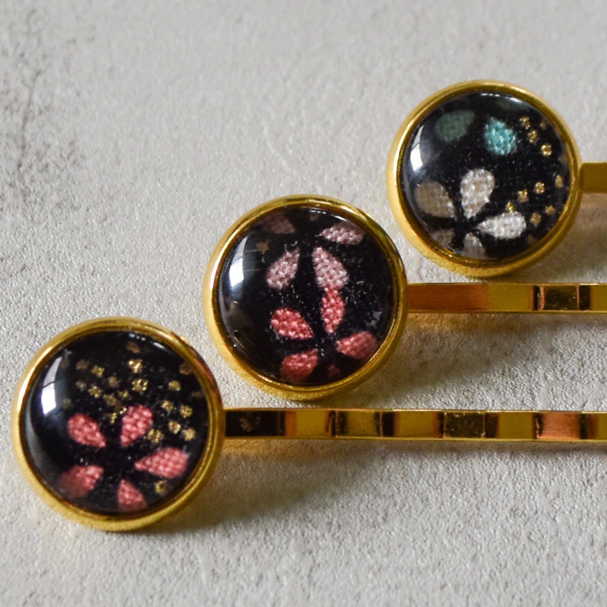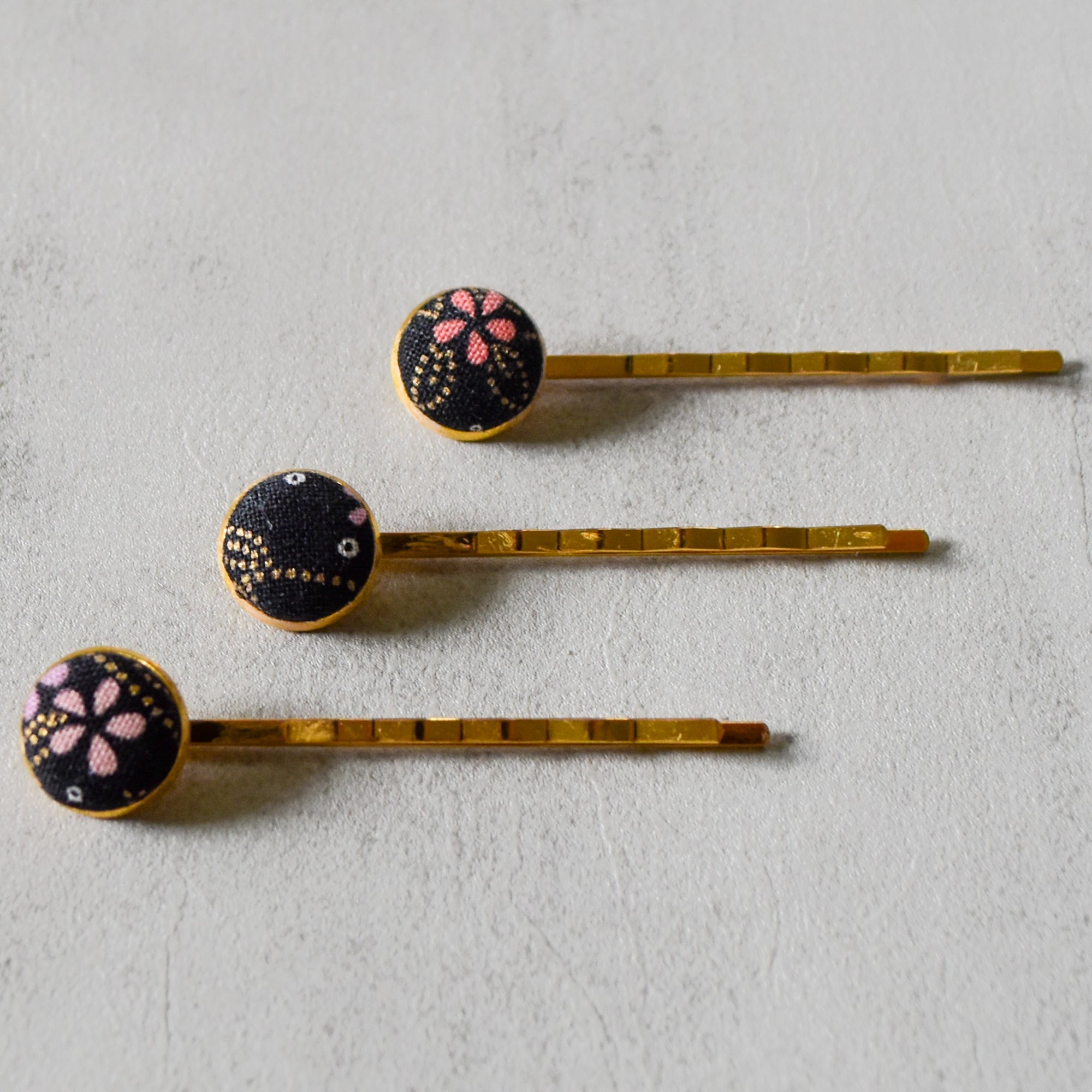 A striking black base highlights delicate pink and blue flowers with gold accents in a Japanese-inspired print, creating a bold yet elegant look on each bobby pin.