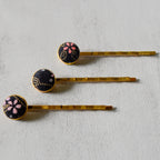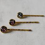 These lightweight bobby pins come in sets of three, featuring either fabric-covered buttons or glass cabochons with fabric beneath, all set in metal bezels. Designed to hold hair with simple, classic style.