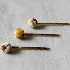 These lightweight bobby pins come in sets of three, featuring either fabric-covered buttons or glass cabochons with fabric beneath, all set in metal bezels. Designed to hold hair with simple, classic style.