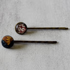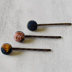 A rich Japanese-inspired print in dark blue, browns, and reds adds a timeless, artisanal charm to each bobby pin. The intricate design brings subtle depth and warmth to any hairstyle.