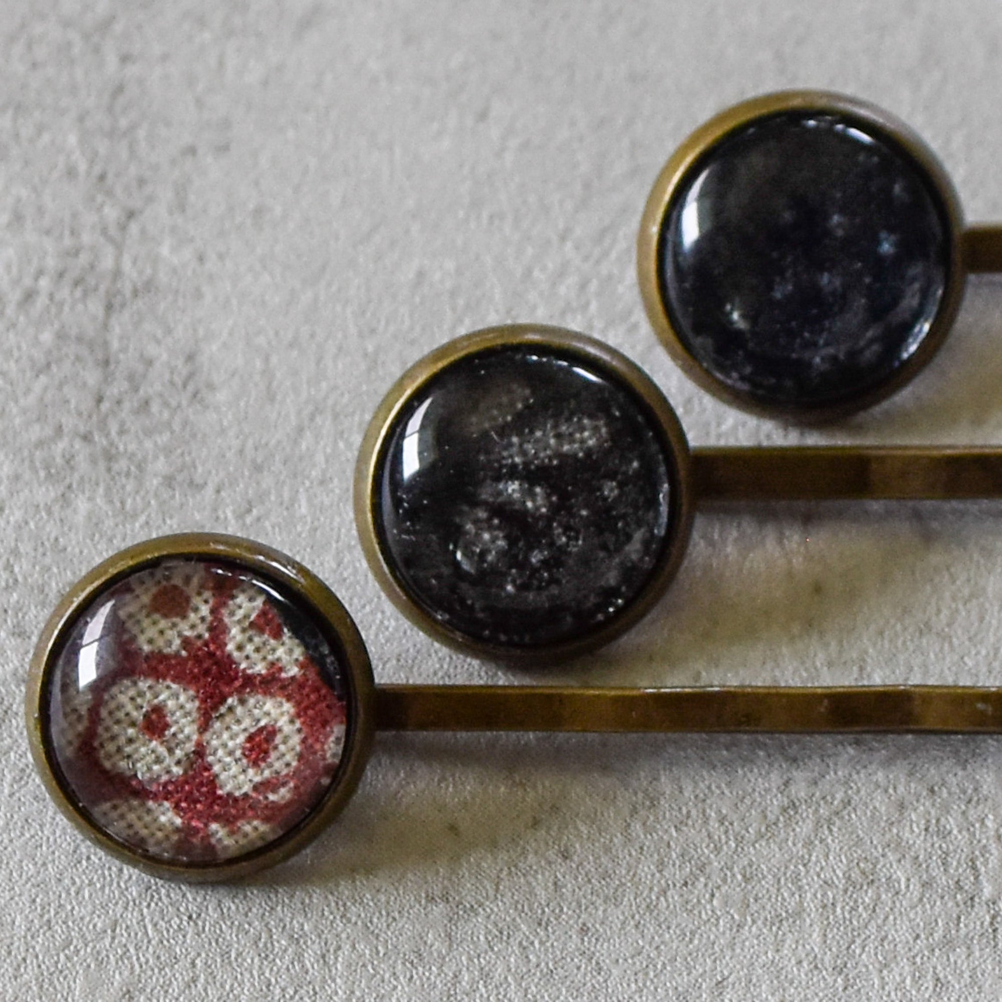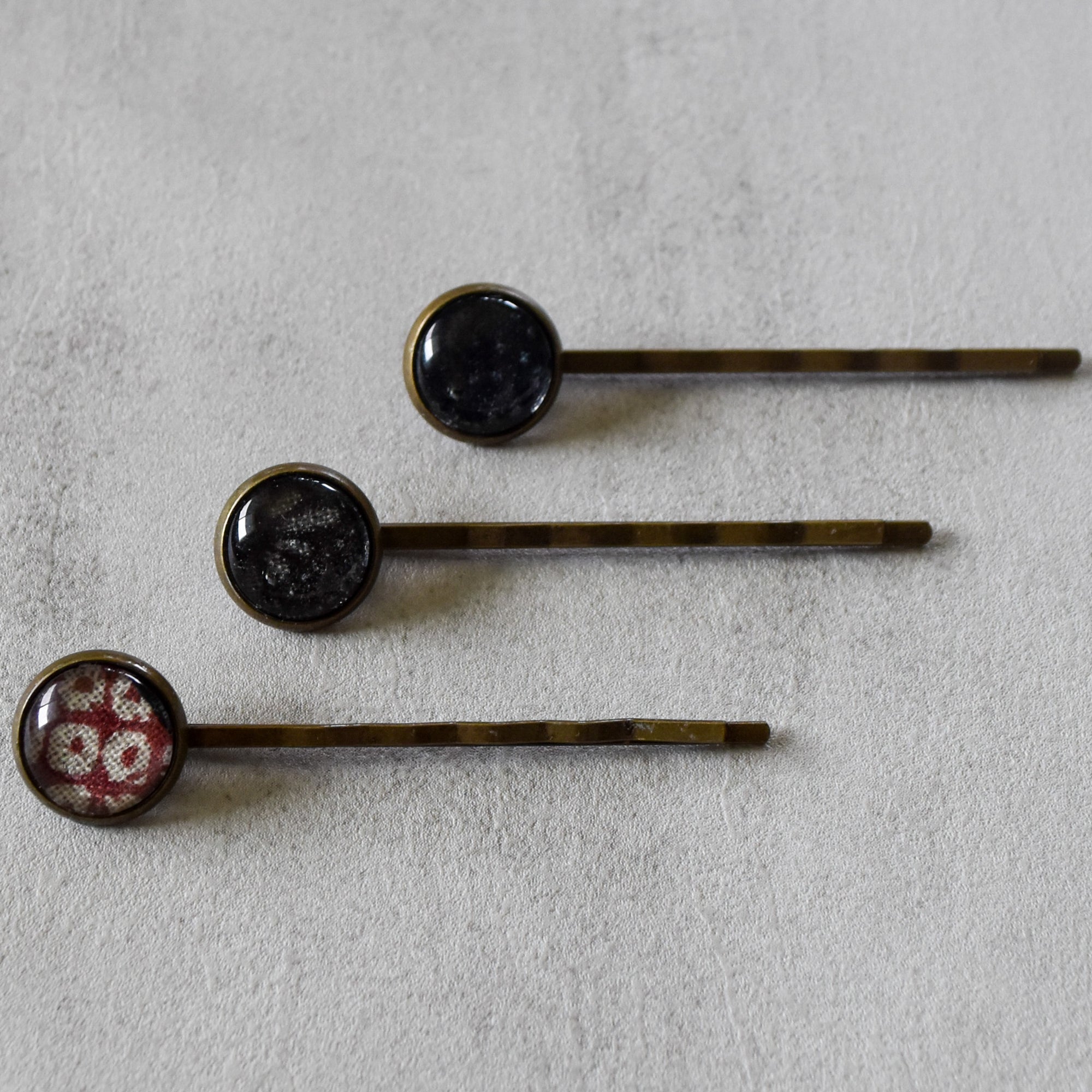 These lightweight bobby pins come in sets of three, featuring either fabric-covered buttons or glass cabochons with fabric beneath, all set in metal bezels. Designed to hold hair with simple, classic style.