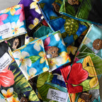 Make your cup of coffee stand out with these bright tropical prints! Each item is lined with a matching cotton print. Each sleeve is accented with a coconut button and elastic loop. Connect the button with the elastic loop to close the sleeve. The elastic and button enclosure allows these sleeves to fit a variety of cup sizes.